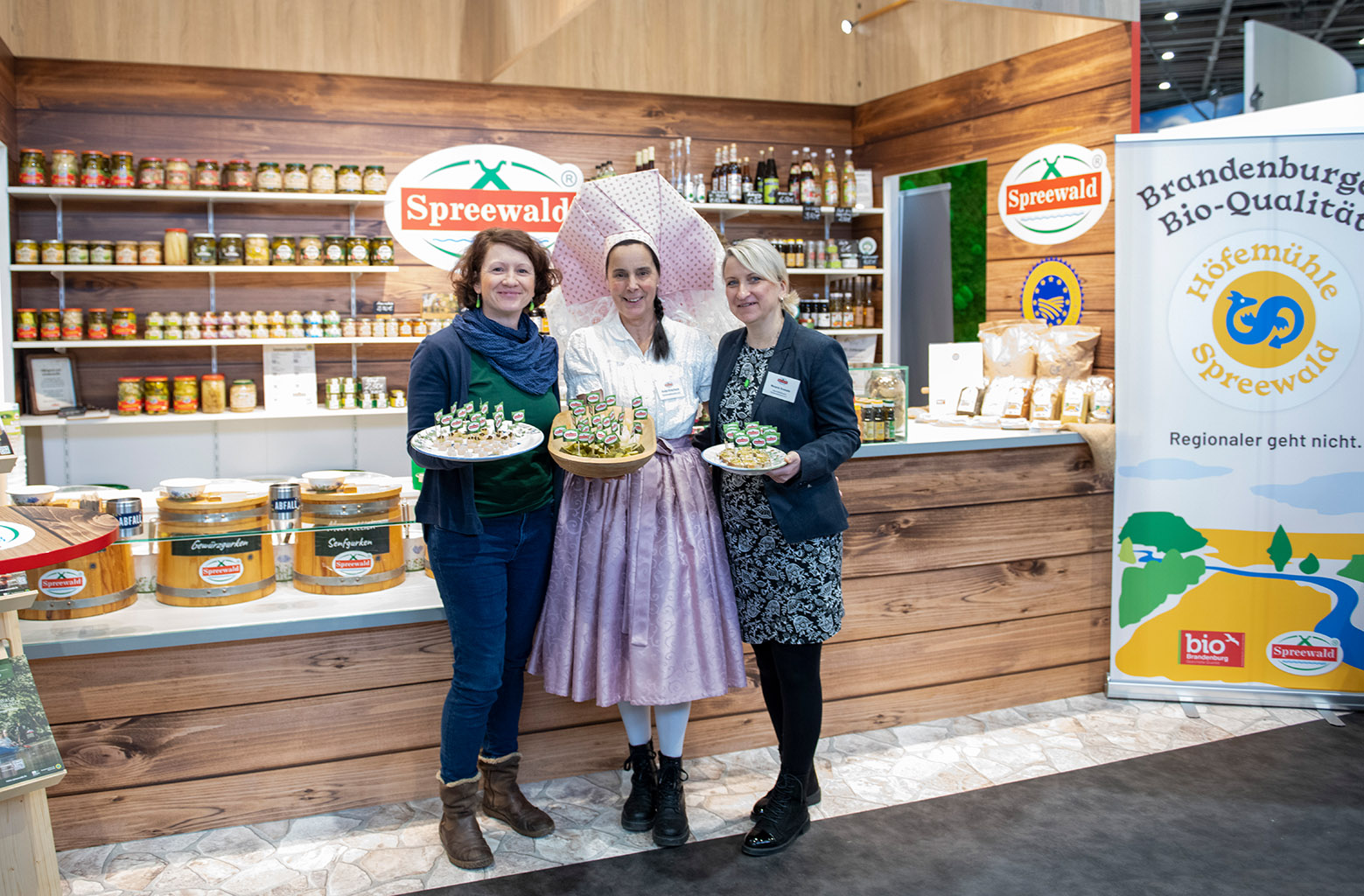 Am Stand des Spreewaldvereins e.V. erhielten Kleinst‑ und Kleinproduzent*innen aus dem Spreewald zudem die Möglichkeit, sowohl neue als auch traditionelle Produkte dem Berliner Messepublikum vorzustellen. Durch die vom Verband pro agro organisierten Händlerrundgänge konnten sie Kontakte zu Einzelhändlern, Großabnehmern und weiteren Vertriebspartnern knüpfen und diese in den kommenden Wochen weiter vertiefen.